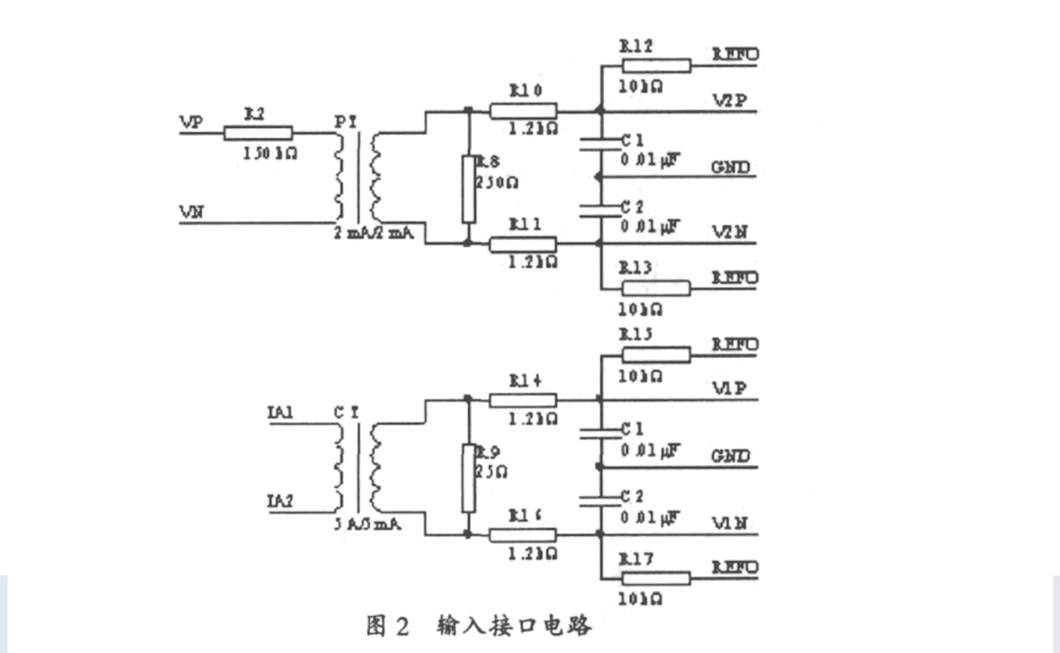 測量單元主要由電流互感器、電流型電壓互感器和專用電能計量芯片ATT7022A 構成, 電流和電壓信號分別經過電流互感器、電壓互感器送ATT7022A 處理。互感器的作用是將測量的電流、電壓信號降低到ATT7022A 電流和電壓ADC 通道的輸入范圍之內, 同時也實現了測量系統和被測系統之間的電氣隔離, 從而可以獲得良好的抗干擾性能。本文采用的二次互感器規格是: 精密電流互感器5A/5mA, 電流型電壓互感器2mA/2mA, 對于電壓、電流不在二次互感器范圍之內的, 需加一次互感器將電壓、電流值降至二次互感器測量范圍之內, 一次互感器與二次互感器的變比只需通過人機接口- 鍵盤進行設置即可。輸入接口電路。