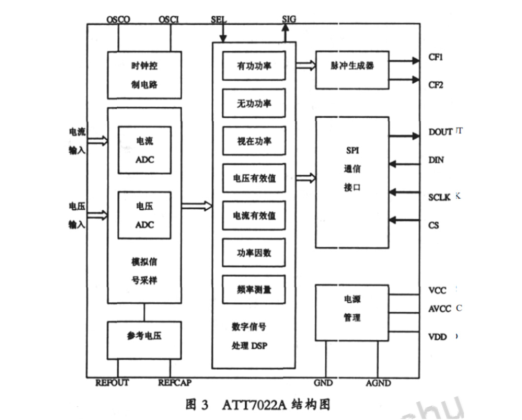 圖2 中, 輸入引腳的VXP 和VXN 的直流偏置電壓為2.4V 左右, 偏置電壓由ATT7022A 芯片的第11腳REFOUT 提供。由電阻1.2kΩ和電容0.01μF 構成了抗混疊濾波器放置在ADC 的模擬輸入之前, 用于防止由于采樣可能引起的失真( 即混疊) 。ATT7022A 是一款高精度三相電能專用計量芯片。如圖3 所示, 內部結構主要包括電源監控電路、模/數轉換電路和計量模塊。電源監控電路是對模擬電源(AVCC) 進行監控, 當電源電壓低于4V±5%時, 芯片將被復位, 有利于電路上電和掉電時芯片的正常啟動和正常工作。電源監控電路被安排在延時和濾波環節中, 在最大程度上防止了由電源噪聲引發的錯誤。芯片內部集成的6 路16 位Σ- ΔADC 使芯片對有功功率的測量精度可達到0.2S 級。功率、能量、有效值、功率因數以及頻率測量的數字信號處理電路, 能夠測量多種電力參數,充分滿足電力監控系統的測量需求。特別是ATT7022A 還支持軟件校表, 提高了校表精度。該芯片的電壓、電流信號采用雙端差分信號輸入, 電壓通道有效值在10mV 至1V 的范圍內線性誤差小于0.1%,電流通道有效值在2mV 至1V 的范圍內線性誤差小