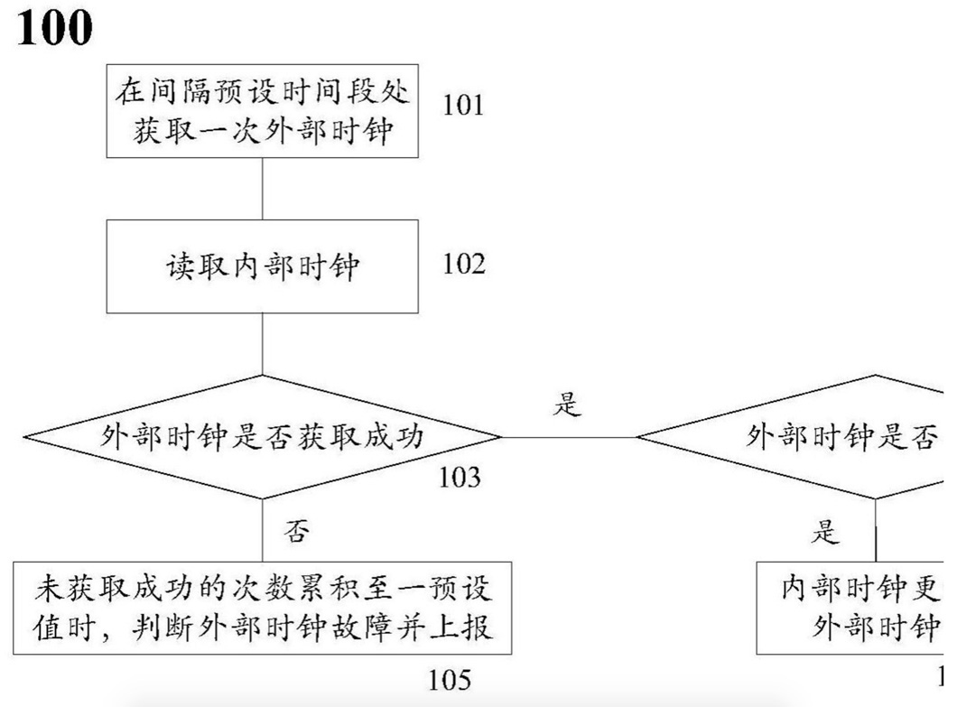 若是,判斷獲取的外部時(shí)鐘與起始時(shí)間之差是否小于(n/2-1)秒:若是,則外部時(shí)鐘異常;其中,所述起始時(shí)間為第一次成功讀取的外部時(shí)鐘的時(shí)間;否則,外部時(shí)鐘無(wú)異常。